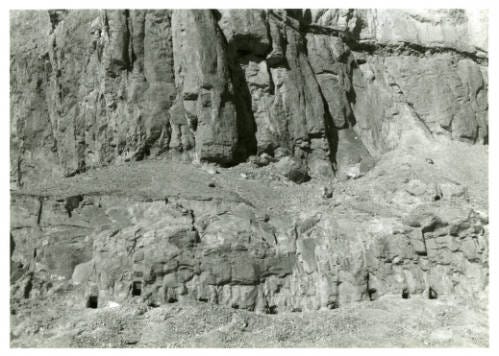 In 1945, two brothers from the hamlet of al-Qasr near Nag Hammadi walked with their camels to the base of the cliffs of Jabal al-Tārif to collect fertilizer from the talus fields that collect at the bottom. Just above the talus fields, caves run across like a row of ancient apartments. These caves have been used by the dead and the living for millenia. Elaine Pagels, in her book The Gnostic Gospels tells us that, “Originally natural, some of these caves were cut and painted and used as grave sites as early as the sixth dynasty, some 4,300 years ago.”[1]